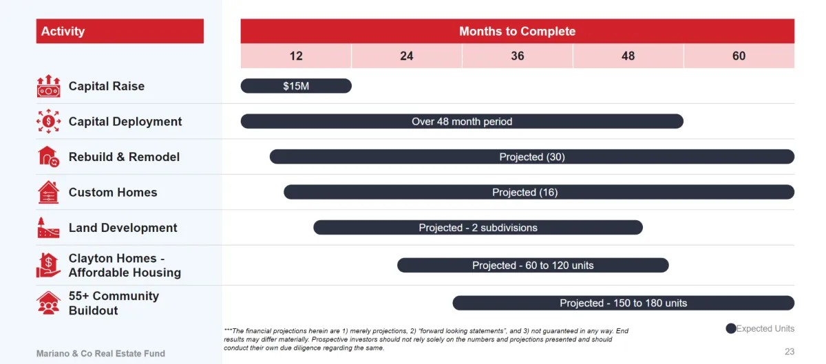 This information on this website and related pages does not purport to be all inclusive or to contain all of the information that a recipient may require to make an investment decision and is qualified in its entirety by the official offering materials for each respective offering, including private placement memoranda. NOTHING presented herein should be taken as investment, advisory, financial, or legal advice and all visitors are encouraged to seek their own legal and financial counsel prior to making any investment decisions. There is no guarantee that any of the estimates or projections presented will be achieved. The recipient should not rely on any information contained herein as no investment, divestment, or other financial decisions or actions should be based solely on the information on this site and related pages. Actual results will vary from the projections and such variations may be material, including the possibility that an investor may lose some or all of its invested capital. Nothing herein is investment advice.